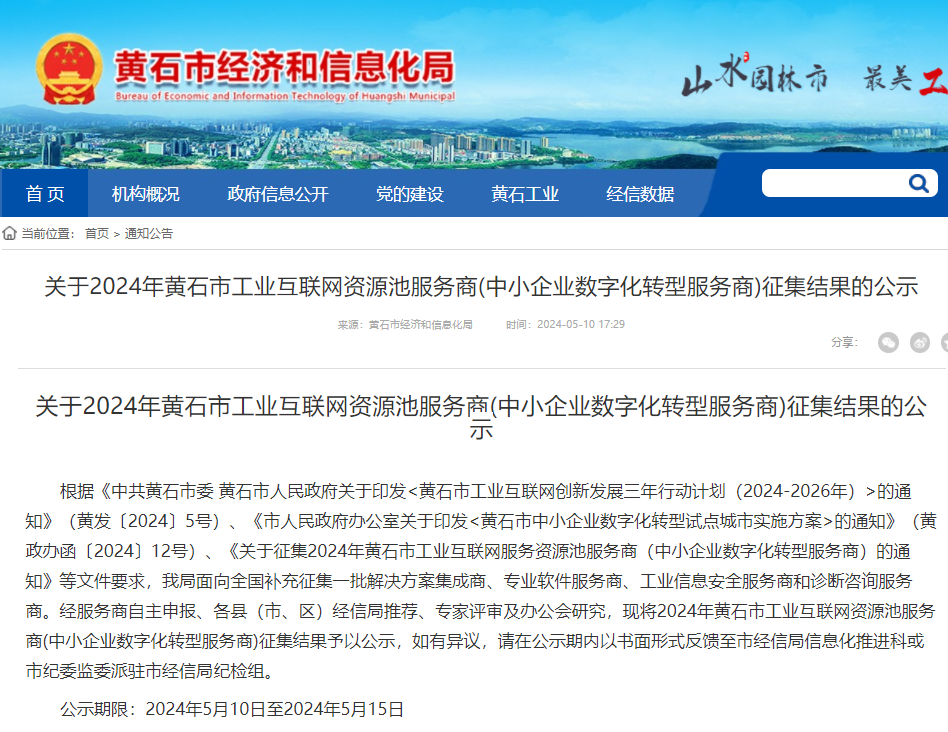 2024年5月,由黃石市經信局發(fā)布《關于征集2024年黃石市工業(yè)互聯(lián)網服務資源池服務商(中小企業(yè)數(shù)字化轉型服務商)的通知》,20家單位成功獲批成為中小企業(yè)數(shù)字化轉型服務商。武漢智能裝備工業(yè)技術研究院以專業(yè)軟件服務商、診斷咨詢服務商為服務方向,獲評成為黃石市中小企業(yè)數(shù)字化轉型服務商之一。